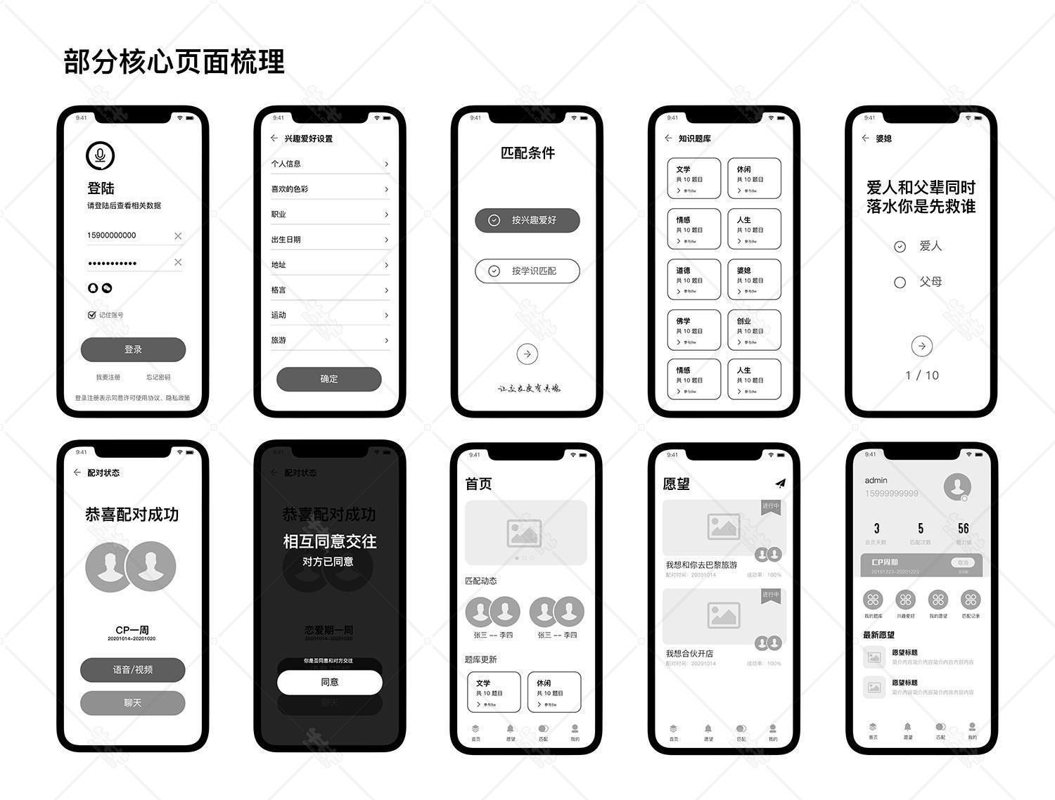 ai 社交 app 交友 原型 草图 方案 首页 配对 答题 我的 个人中心 愿望 登录 注册