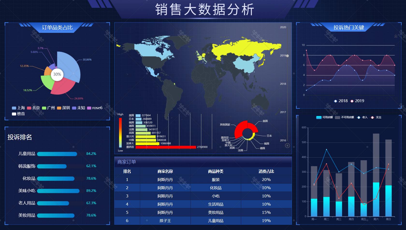 全球 销售 大数据 分析 大屏 看板 echarts 实例 前端 代码 模板 静态页面 暗色系 酷炫 下载 驾驶舱 仪表盘