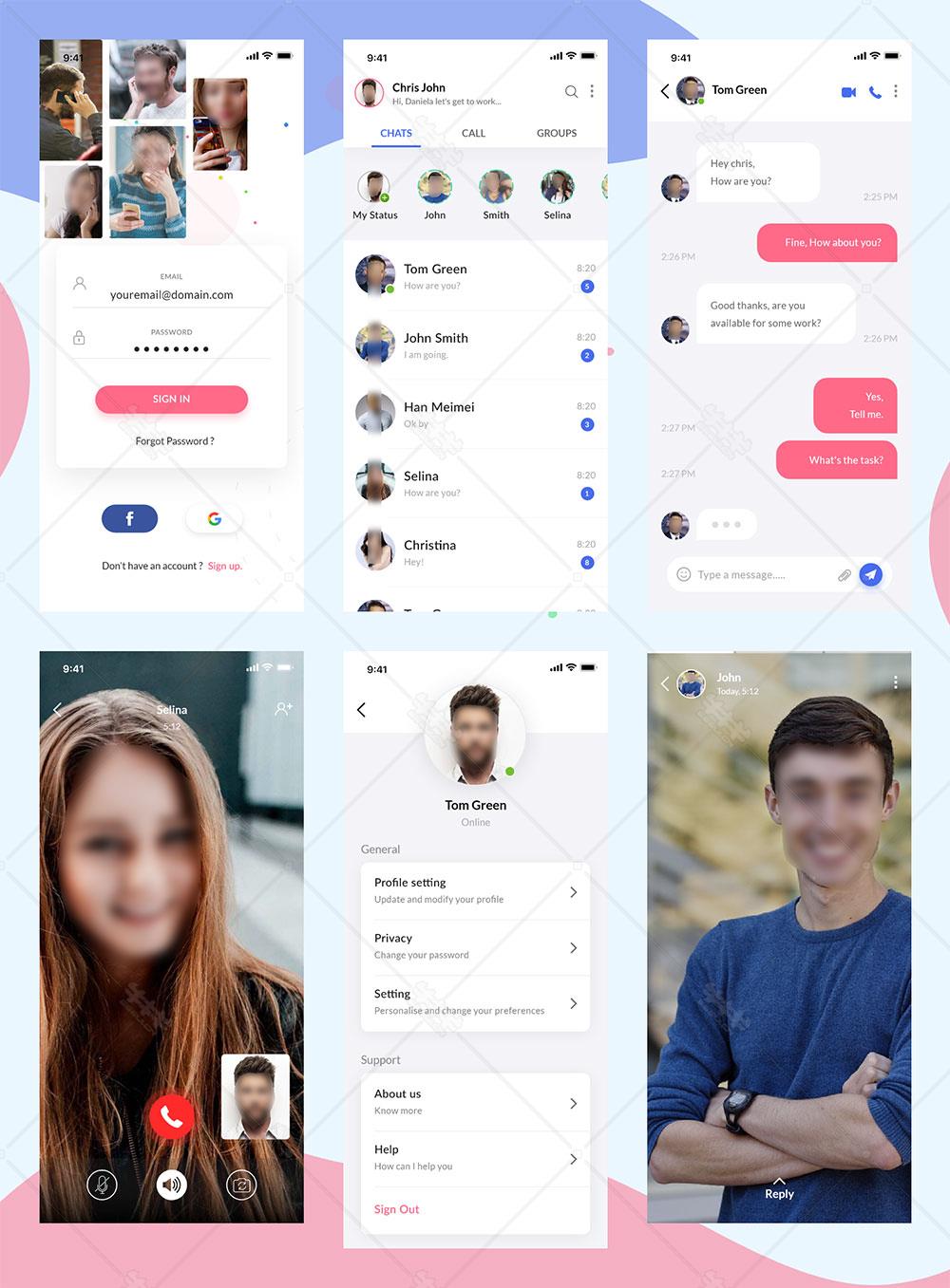 xd 粉色 通透 社交 app 登陆 注册 聊天 通话 拨打 视频 首页 列表页 详情页 沟通 个人 主页 模板 源文件 下载